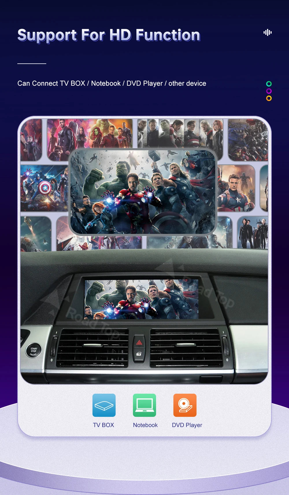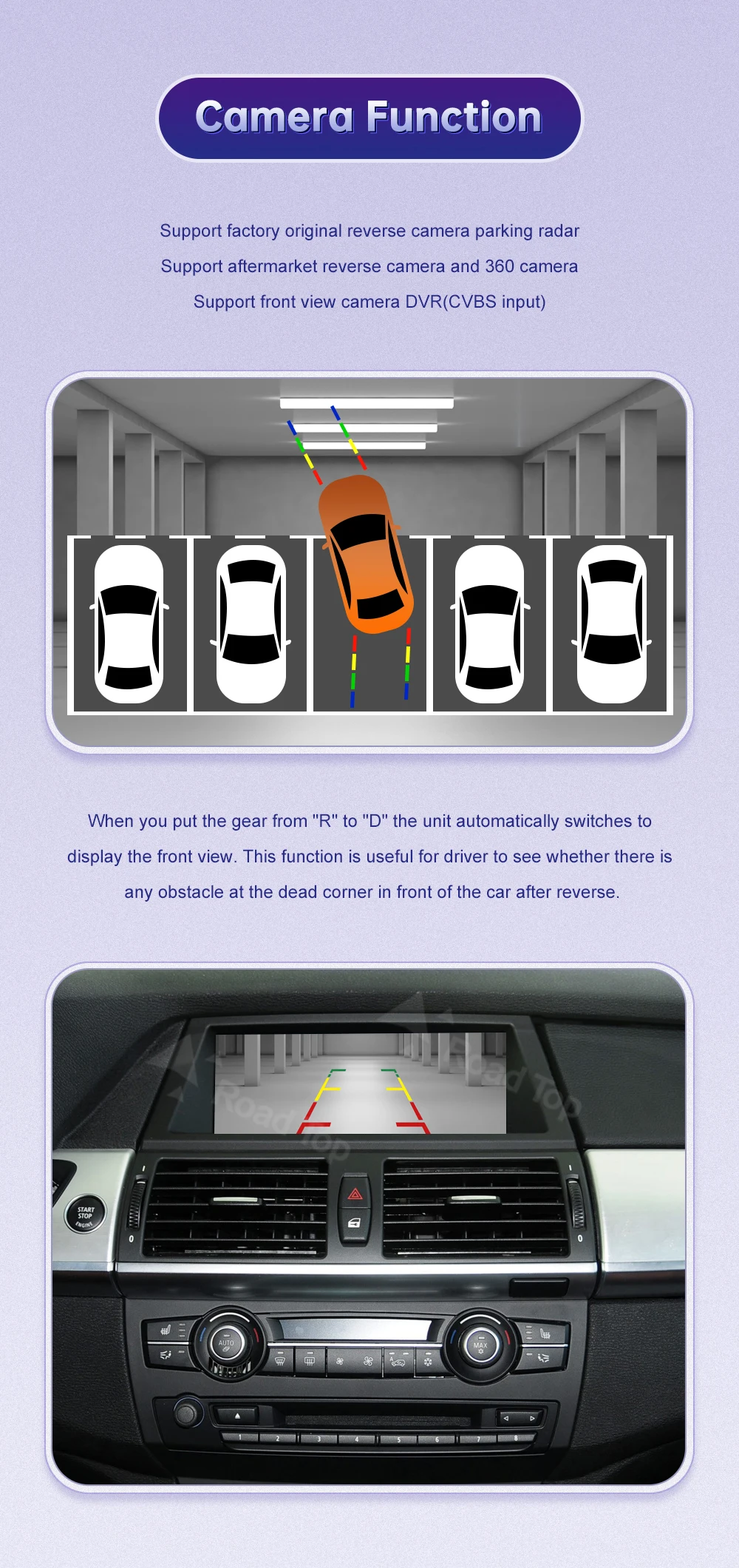 5) Support aftermarket rear view & DVR & 360 camera input