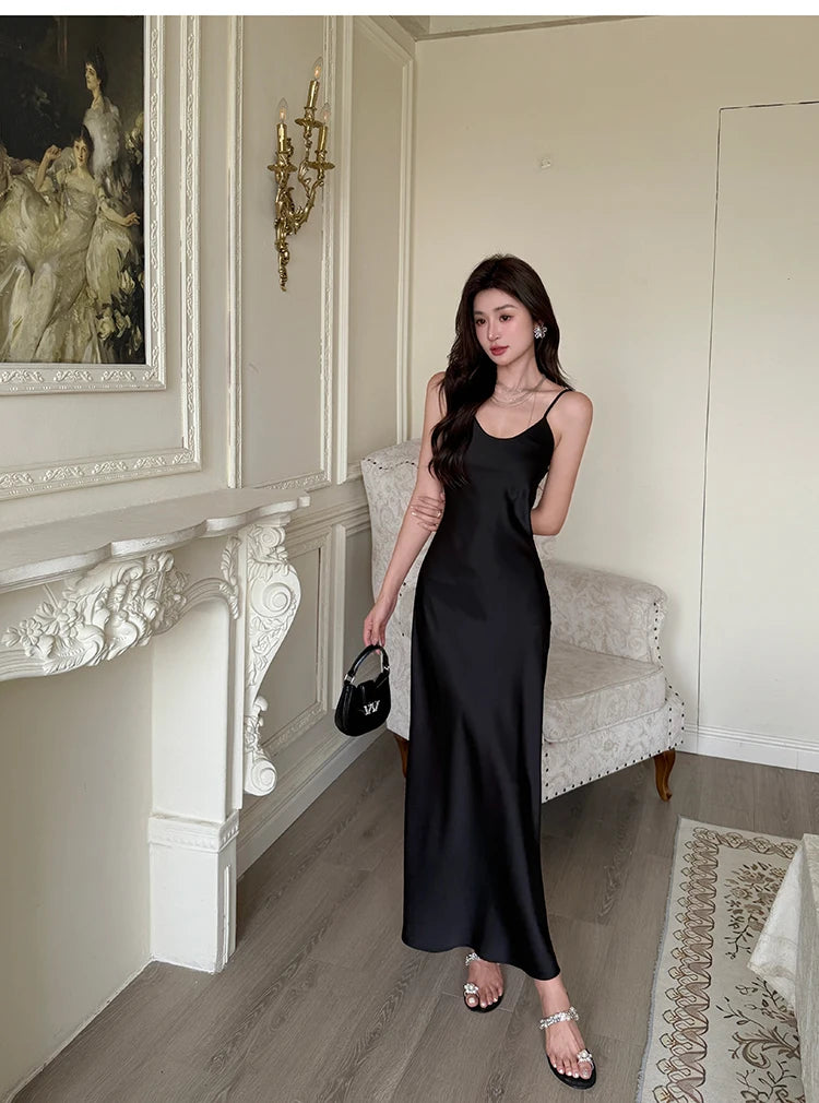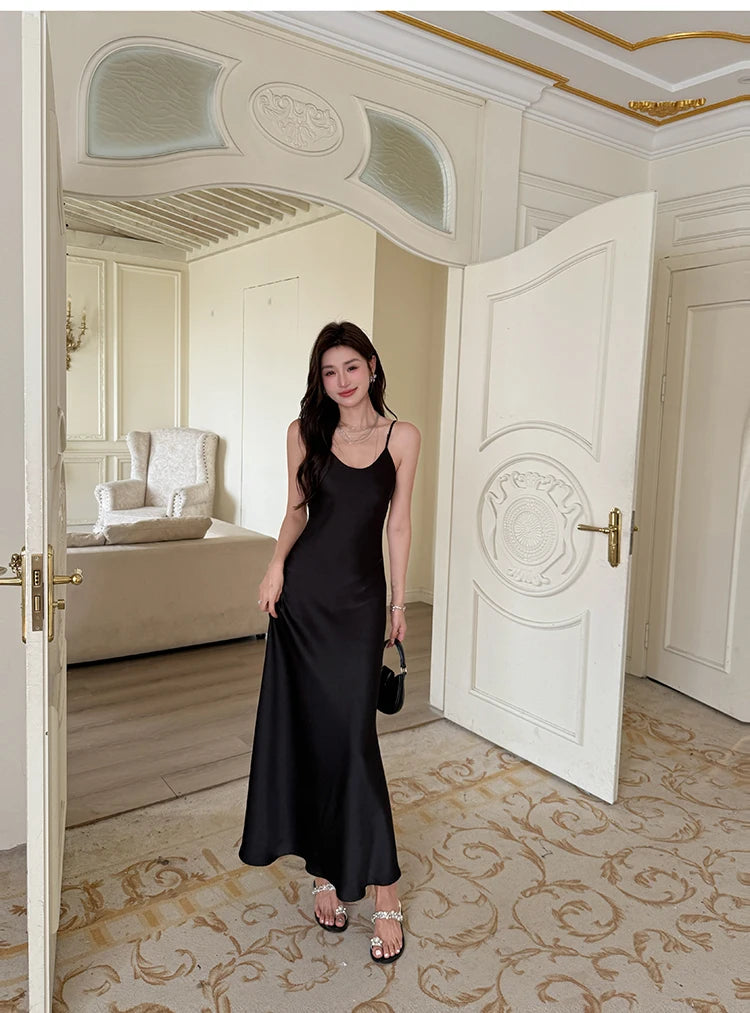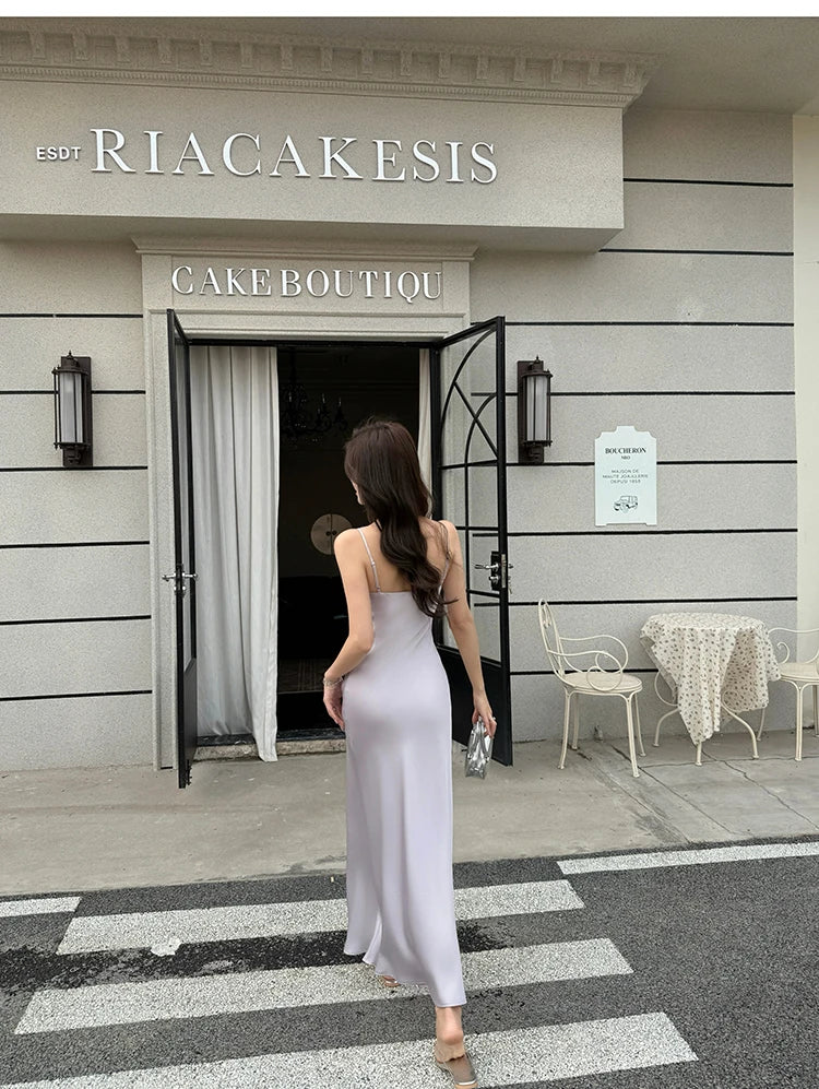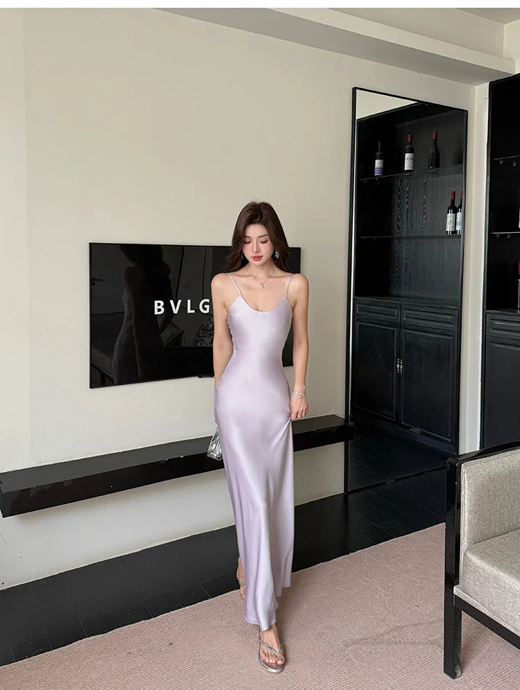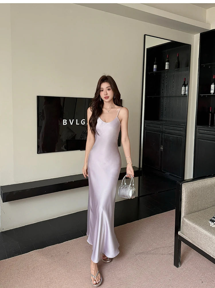 Women Long Dress Elegant Satin V-neck Suspender Dress Summer Sleeveless Slim Party Club Formal