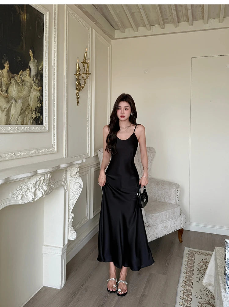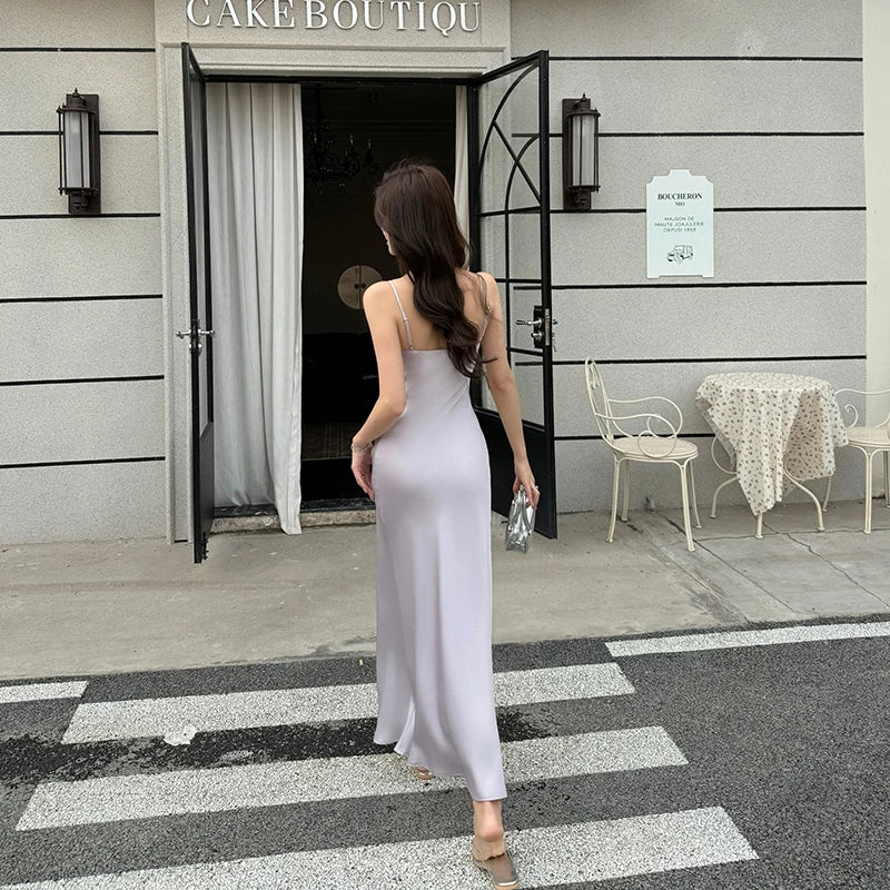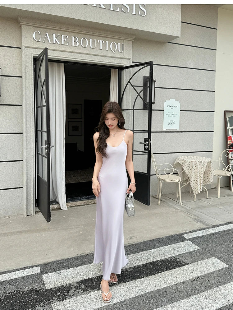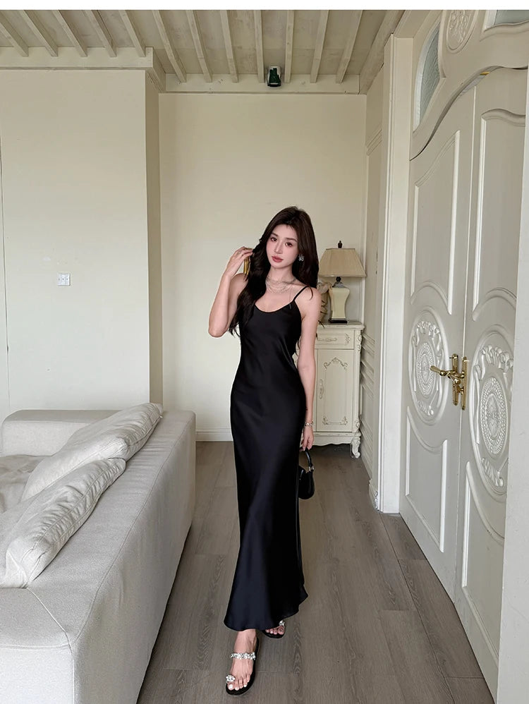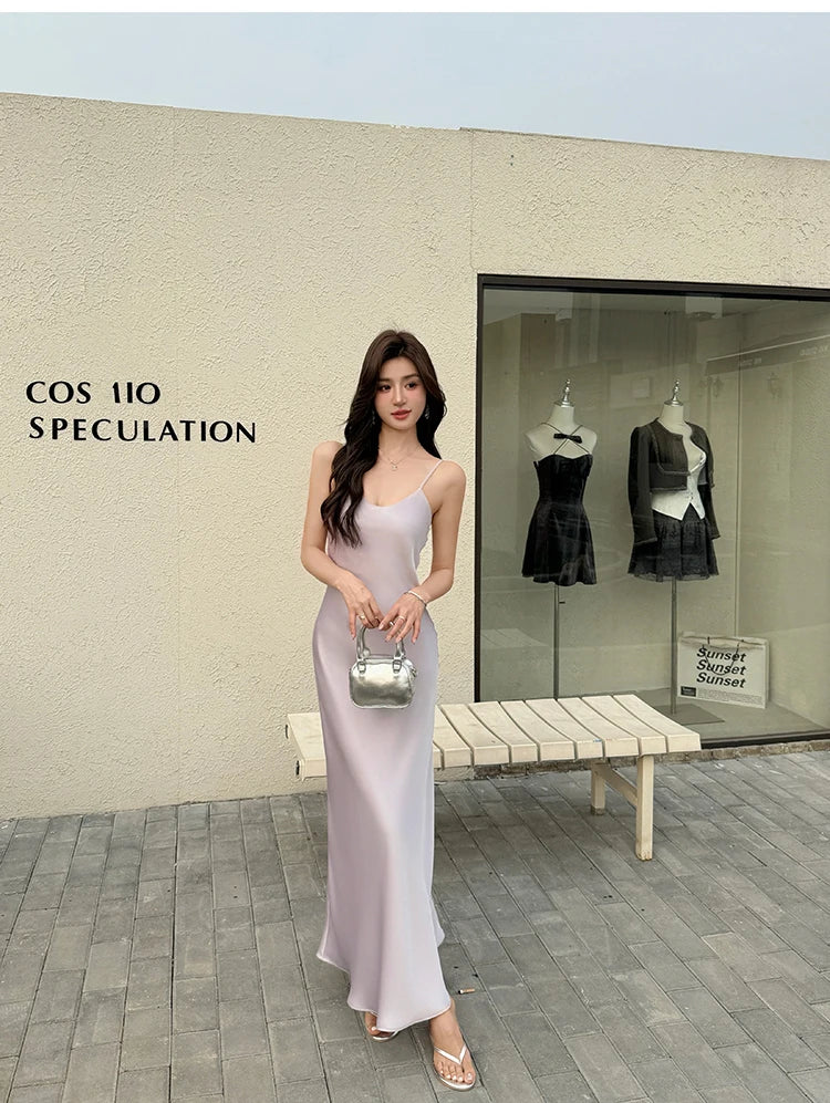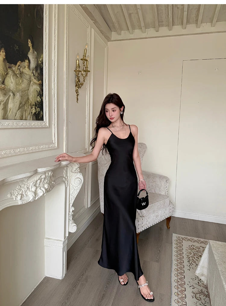 Women Long Dress Elegant Satin V-neck Suspender Dress Summer Sleeveless Slim Party Club Formal