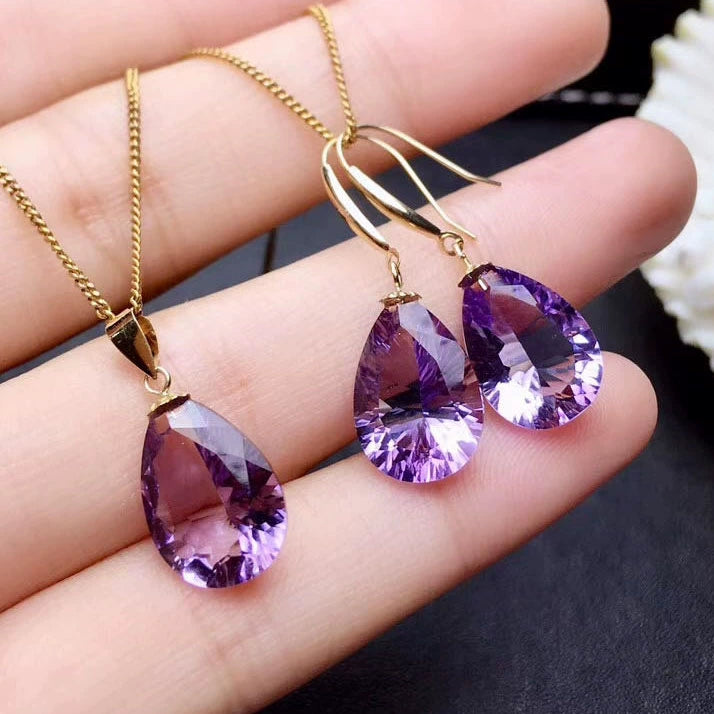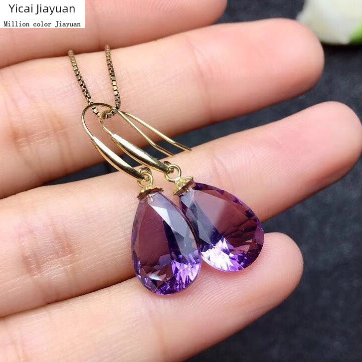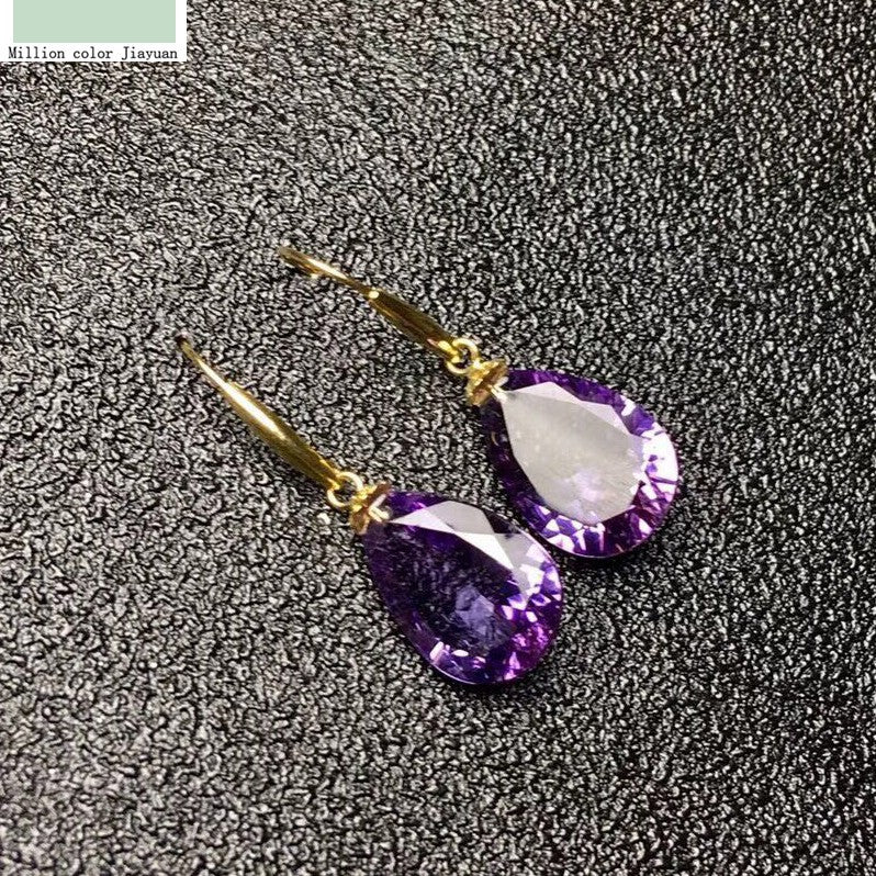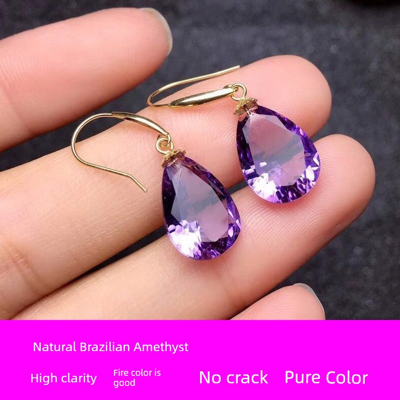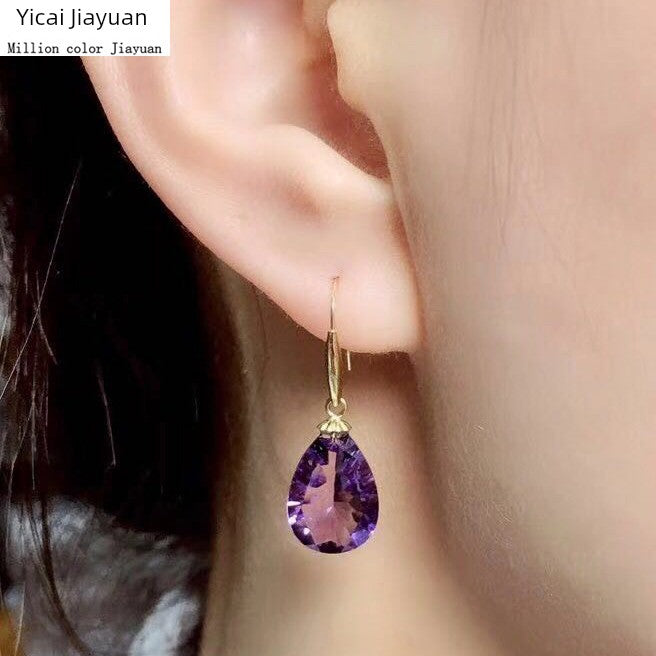 18K Gold Gold Rose Gold Ear Hook Long Water Drop Amethyst Earrings Women's Colorful Gem Japanese and Korean Earrings Earrings
