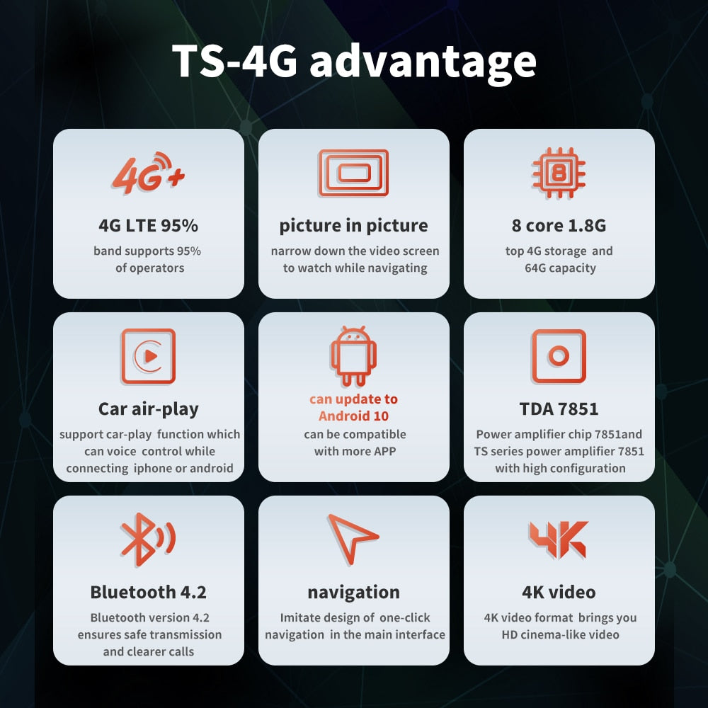 Support 4G Lte internet , support 5G wifi function, bluetooth up to 5.0 version . support video output headrest function , also call pillow monitor .