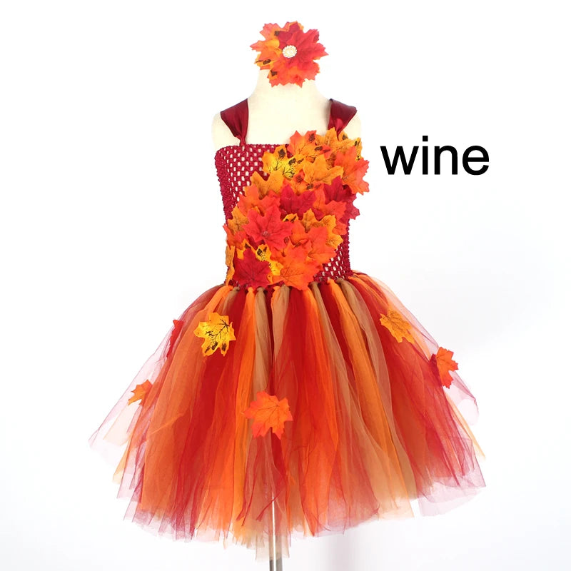 girls dress features 1: fluffy tulle is adorned with lots of maple leaves.
