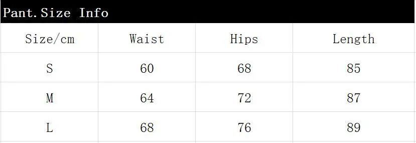 S, Waist: 60 cm, Hips: 68 cm, Length: 85 cm M, Waist: 64 cm, Hips: 72 cm, Length: 87 cm L, Waist: 68 cm, Hips: 76 cm, Length: 89 cm