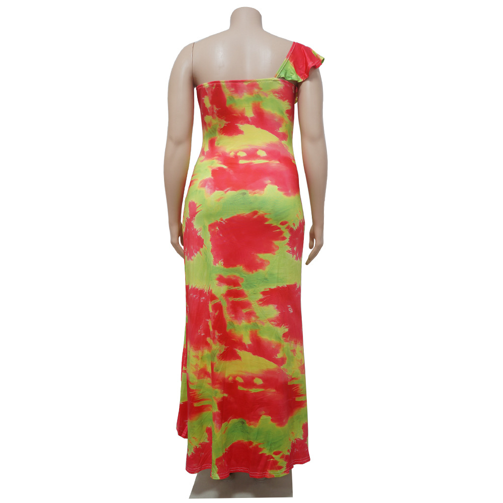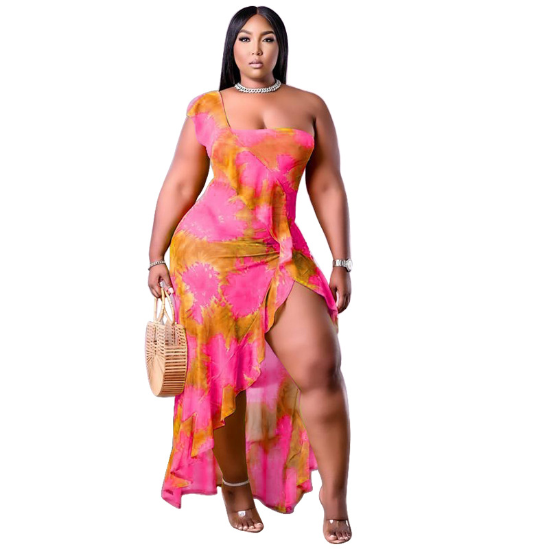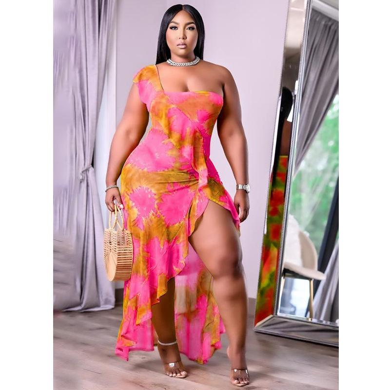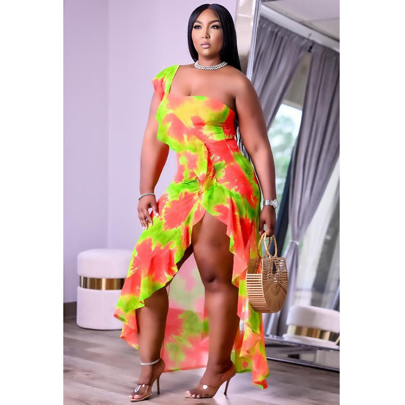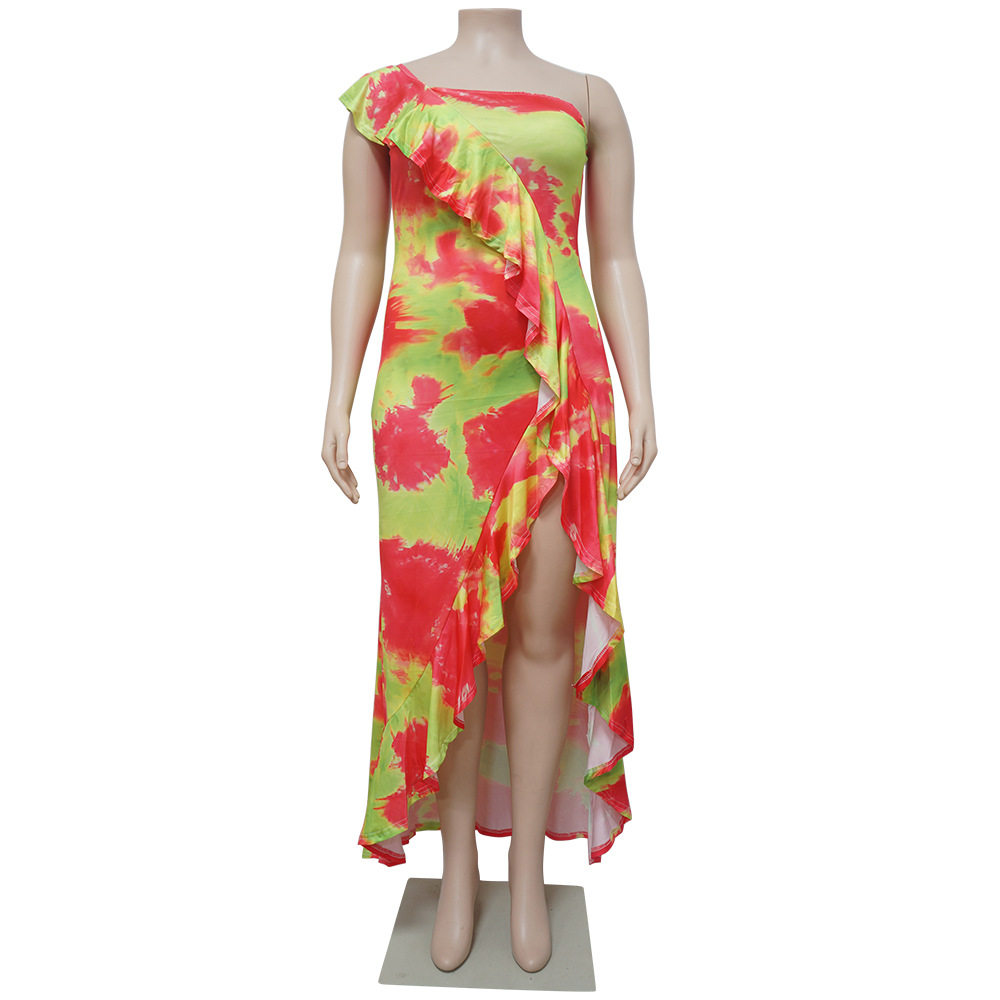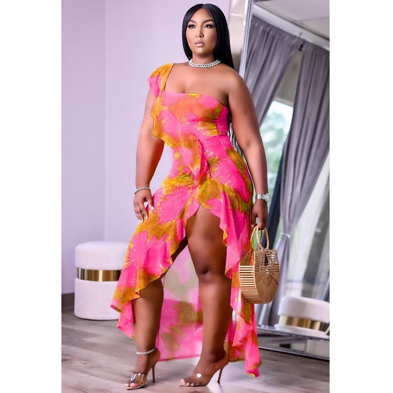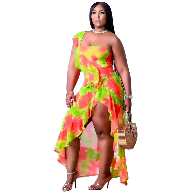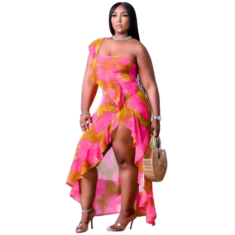 Women's 2021 Summer New Arrival One-Shoulder Irregular Printed Ruffle Hem Plus-Size Dress